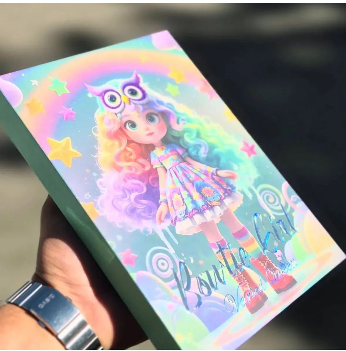 Bright, attractive holographic box with rainbow-themed doll artwork